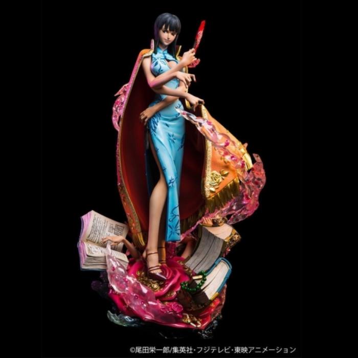 该雕像将动画《海贼王》的DVD系列“ONE PIECE Log Collection”中的“妮可·罗宾”的插图以全高约57cm的大型尺寸立体化,再现了身着旗袍,脸上浮现知性笑容,散发着魅惑气息的“妮可·罗宾”。蓝色旗袍胸口镂空的设计和下身的高开衩大胆性感,另外旗袍上的图案也是打造的非常精致,加上披风也是非常亮眼,整体非常的华贵吸睛。另外该雕像还附带了充满跃动感和魄力的专用台座。