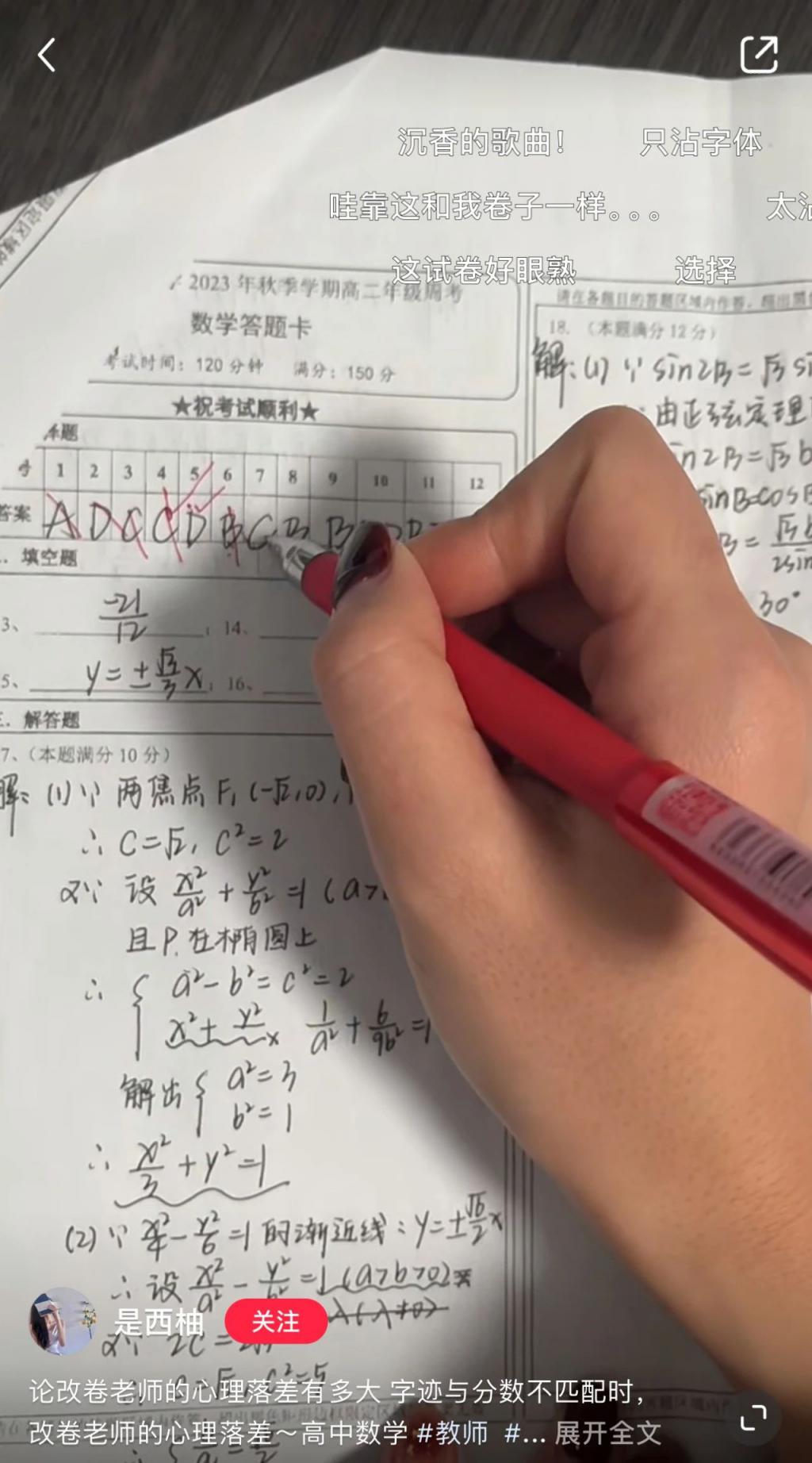 博主 " 是西柚 " 是一名高中数学老师,直播批阅卷子是她的日常。字迹一般,分数好看、如何有效答题、数学答题要注意排版这些细节都引发了网友热议。令人扼腕的是,大多数人在高中时代都错过了老师阅卷名场面,不然好赖再提高几分啊。