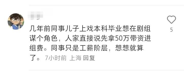 几年前同事儿子上戏本科毕业想在剧组谋个角色,人家直接说先拿50万带资进组费。同事只是工薪阶层,想想就算了。