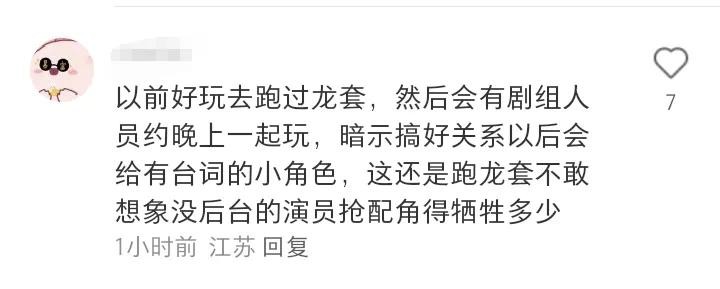 以前好玩去跑过龙套,然后会有剧组人员约晚上一起玩,暗示搞好关系以后会给有台词的小角色,这还是跑龙套不敢想象没后台的演员抢配角得牺牲多少。