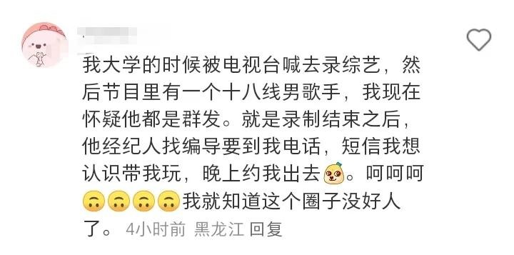 我大学的时候被电视台喊去录综艺,然后节目里有一个十八线男歌手,我现在怀疑他都是群发。就是录制结束之后,他经纪人找编导要到我电话,短信想认识带我玩,晚上约我出去,我就知道这个圈子没好人了。