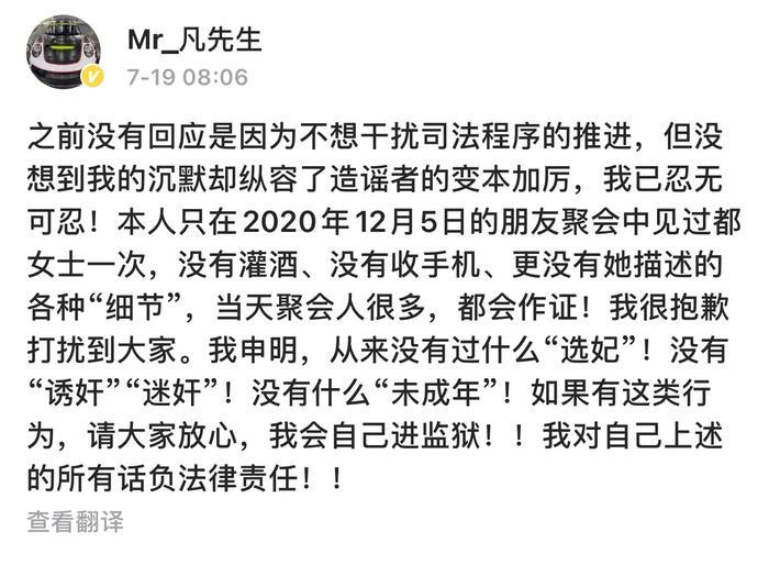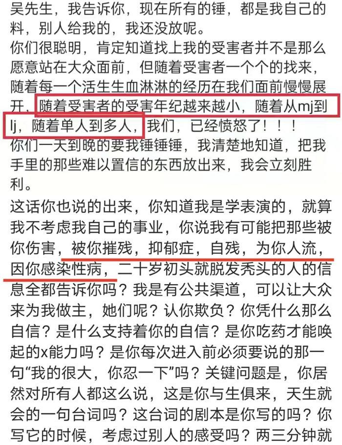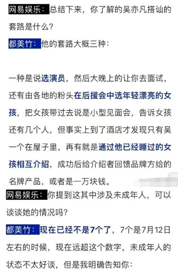 除此之外,还提及了吴亦凡“选妃”的过程,有时以选演员为由,让小姑娘去面试;有时派各地粉头挑选漂亮女孩子带到酒店;有时通过这些女孩子相互介绍,再给予经济回馈,还要求最好是未成年女孩......都美竹在长文中还隐晦地提及了“lj”、“mj”、“✘病”等字眼,如果情况属实,那吴亦凡可不仅仅是私德有亏了。