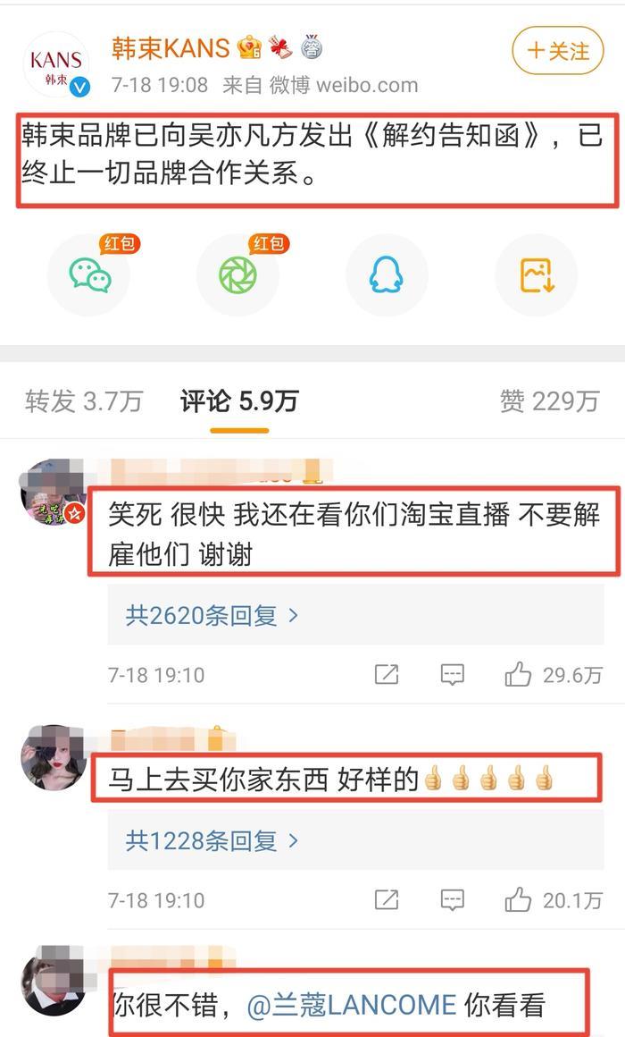 吴亦凡之前都可以说是“桃色绯闻”,而这次如果属实(请注意假设条件),他可是实实在在地在犯法的边缘反复横跳了,网友们群情激愤,呼吁各大品牌赶紧和吴亦凡解约,这一次,绝不能轻飘飘地放过他。在各大品牌们还在观望时,韩束第一个发布声明,宣布已和吴亦凡终止一切合作关系,受到了网友们的一致好评。