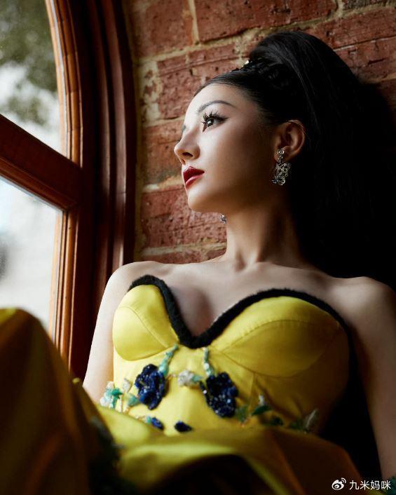 这次活动,迪丽热巴身穿一套亮黄色花朵裹胸礼服,大拖尾裙摆,加上高高扎起的头发,尽显大气。
