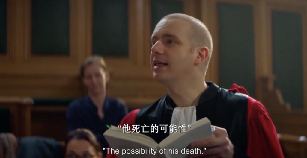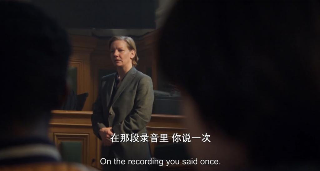 而桑德拉往往独立于画面之中,只偶尔有遮挡物、其他人物的局部出现,因为她始终处于被多个角度的主观审视里,就像被质问小说情节时,电影特地给了一个带遮幅的视角,这个视角就源于原告律师背后,坐在席上的一个人。