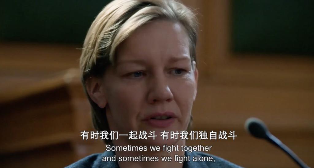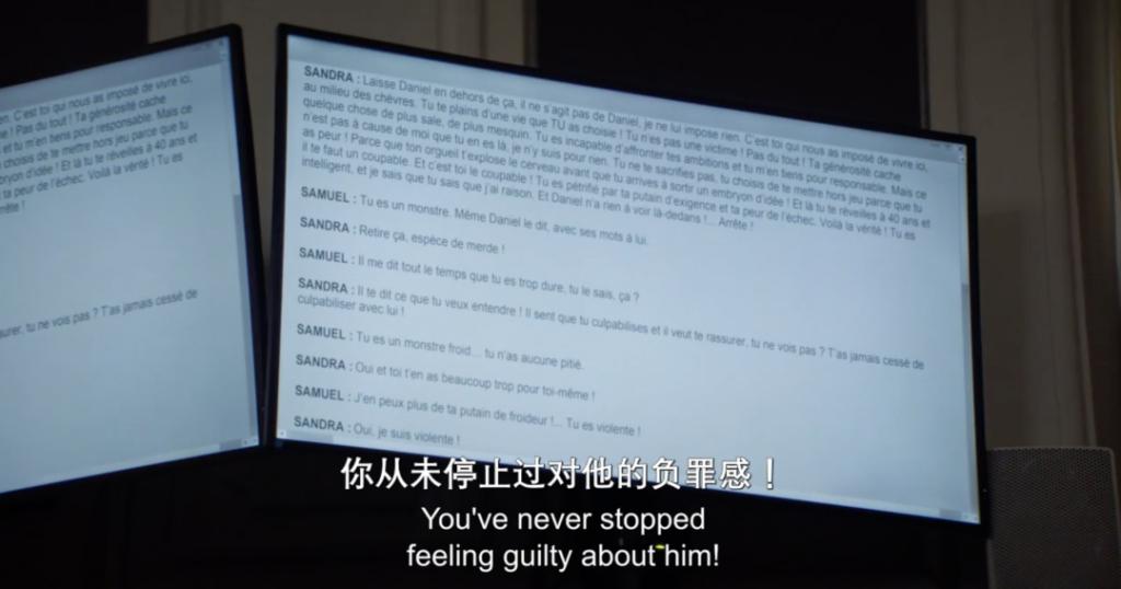 包括结尾里,桑德拉无罪释放,家里依然是狗和孩子,似乎审判没有造成太多的影响,但在多面的审判和自剖下,可以预想她的生活,和孩子的关系,早就和