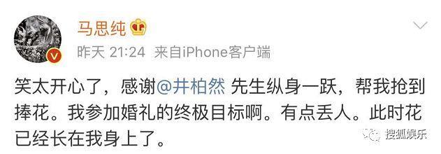啊对了,手捧花最后被马思纯抢到啦,她激动的连发三条微博宣布抢到捧花,还特意感谢井柏然帮她~