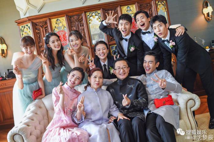 新郎新娘、伴郎伴娘以及唐艺昕父母的合影,两位长辈气质也是真的好啊~