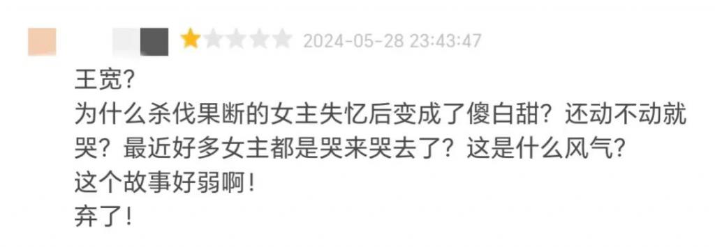 一味弱化、扁平化女主的特质,来突出男主的苏感;打着无脑下饭剧旗号,其实是用那套低智模板洗脑观众;还有披着大女主或双强的皮谈情说爱 ……