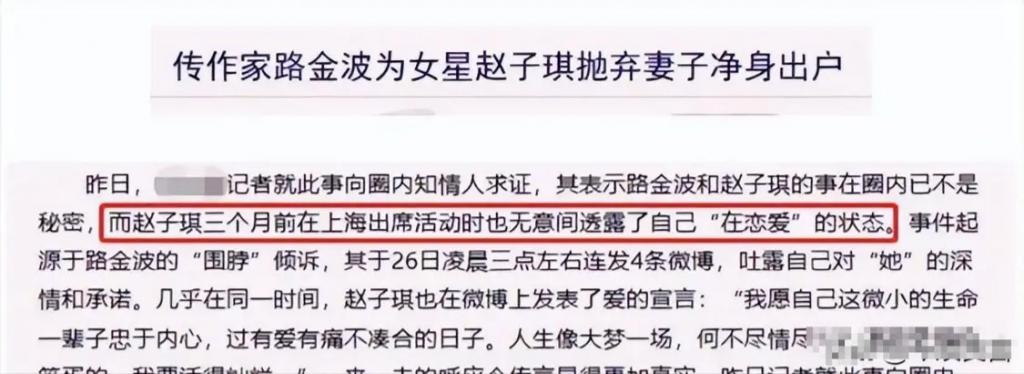 但还是有媒体报道 " 路金波为了女星赵子琪净身出户抛弃妻子。"