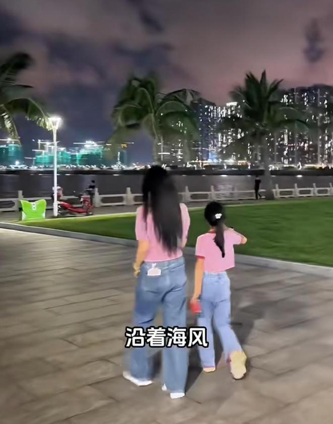 晚上,伊能静又带女儿来到海边吹风。