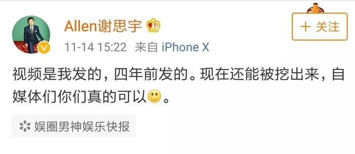 在11月14日,视频里的男主角亲自跳出来回应,视频是自己发的,不过是四年前发的。不过在2014年,娜扎已经参与了多部影视作品和综艺节目,已经成名,娜扎方应该也是不愿意这段视频被放出的。也难怪诸多网友对他理直气壮的态度表示不爽。