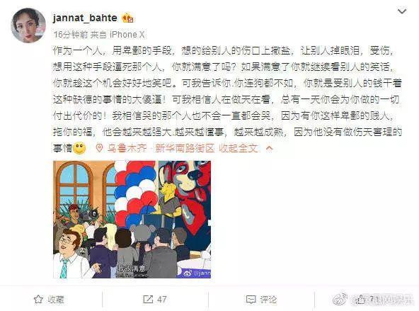 娜扎的姐姐因为心疼娜扎被网暴亲自发微博表示“作为一个人,用卑鄙的手段,想给别人的伤口撒盐,让别人掉眼泪、受伤,想用这种手段逼死那个人,你满意了吗?”