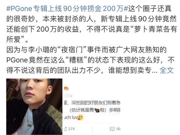 李小璐和PGone在出事后完完全全就是不同的境遇,PGone有死忠粉,所以就算他不能明面出席活动赚钱,但私下依然有强大的粉丝购买力来让他捞金。