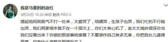 马蓉妈妈徐红发微博霸气十足,不仅手撕王宝强,还连亲家母一起撕,嫌弃王宝强父母是农村人,没文化。说王宝强妈妈心机婊,喜欢哭,素质低,还喜欢装。并暗示王宝强配不上马蓉,跟马蓉门不当户不对,当初自己是反对的。