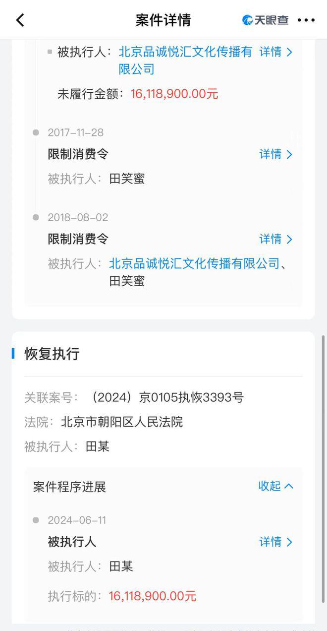 案件流程显示,2016 年 7 月,该案件首次执行。此后,田笑蜜及其与朱丹共同经营的北京品诚悦汇文化传播有限公司被列为失信被执行人,并被限制高消费,该案也被列为终本案件。