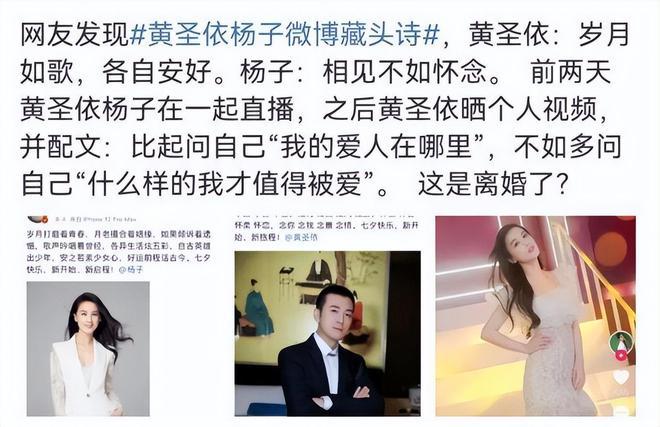 去年 9 月,黄圣依杨子突传婚变,网友发现,两人七夕发的文案,疑似藏头诗,被猜测是不是悄悄离婚了。除此之外,杨子还清空了与黄圣依有关的一些动态,两人也有一段时间没再互动。