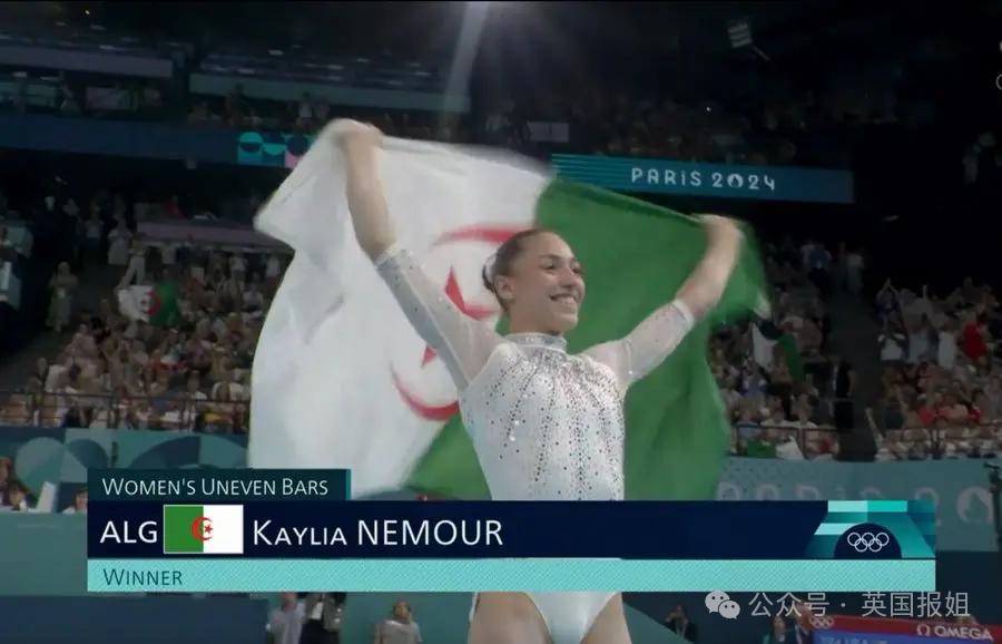 8 月 5 日,阿尔及利亚选手,17 岁小将凯莉亚 · 内穆尔高分夺得体操女子高低杠金牌。