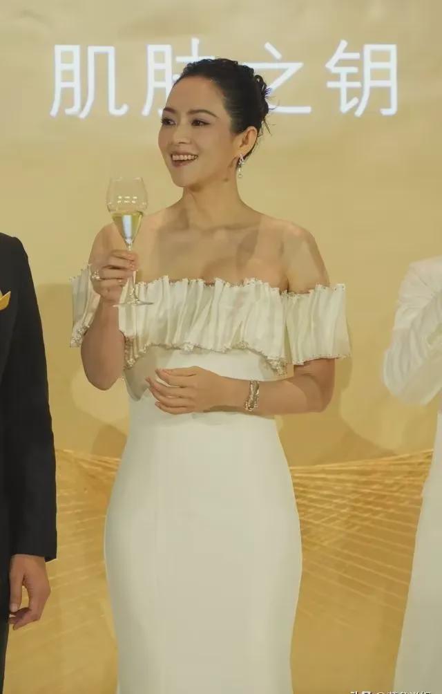 章子怡身穿一袭轧地的白色蕾丝抹胸礼服裙,妆容素雅,眉目如画,举手投足间散发着自信高雅的气质。