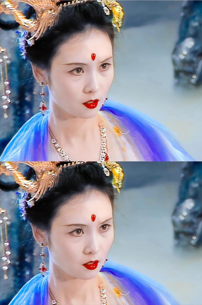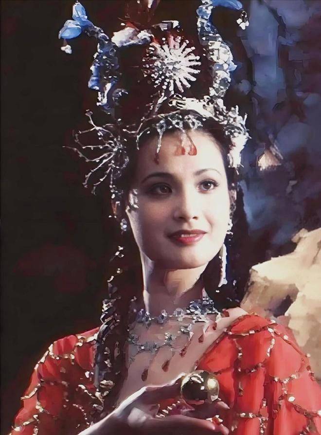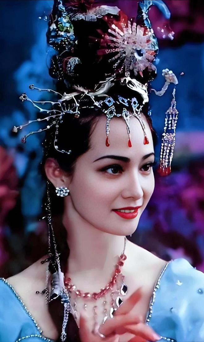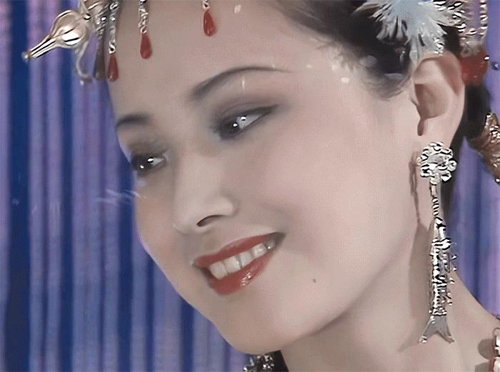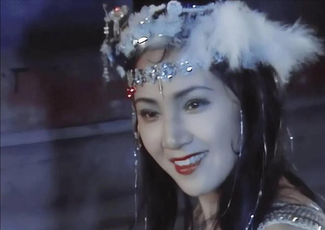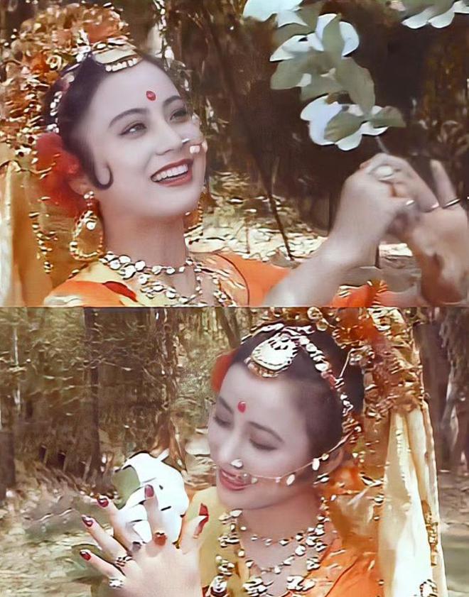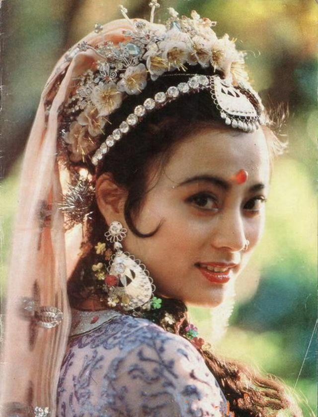 玉兔精下凡,冒充起了天竺公主,造型有异域风情,面纱、红点,鼻环,金灿灿的头饰,李玲玉一回眸,一抬头,特别灵动。