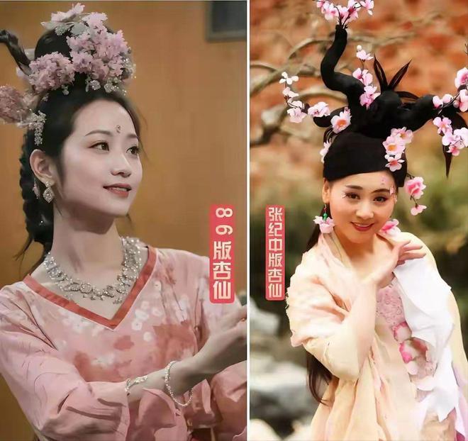 86 版直接用大量的杏花头饰点缀,突出一个美字,名字里的 " 仙 ",就说明她并非一般女妖精。