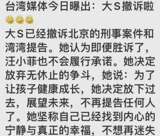 大 S 这次撤回了在北京对汪小菲的刑事指控。自称是为了孩子的健康成长,而且说就算胜诉汪小菲也不会遵守承诺。