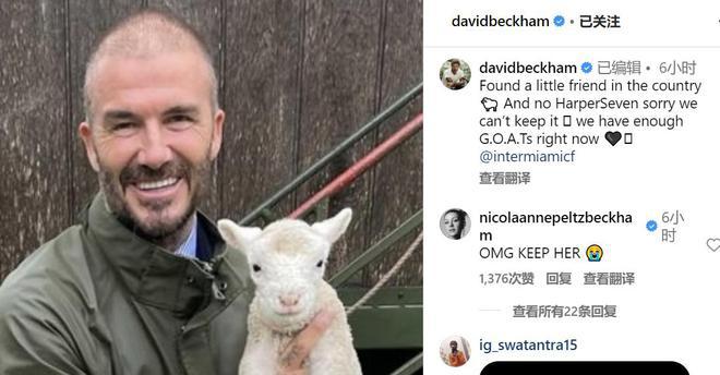 11 月 10 日,贝克汉姆在社交账号中分享了一张抱着一只小山羊的照片并配文:" 在乡下发现了一个小朋友,哈珀小七不在,抱歉,我们没办法留下它,我们现在已经有足够多的山羊了 "。事实上,贝克汉姆一家都非常有爱心,家里养了猫猫狗狗等不少的宠物,而且在乡下还有一栋面积超大的乡村别墅,足以收养很多动物。他忽然说不会留下这只小羊,让粉丝们颇为费解。就连儿媳妮可拉 · 佩尔茨看到公公说无法收养都非常着急,快速回应:" 天呀,留下她吧。",还附上了一个流泪的表情符号。评论区中,也有不少粉丝都认为这只小羊非常可爱和可怜,建议贝克汉姆收留下来。