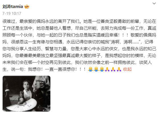 前不久郑佩佩离开,刘涛与 " 佩妈 " 的忘年友情也被大家注意到。