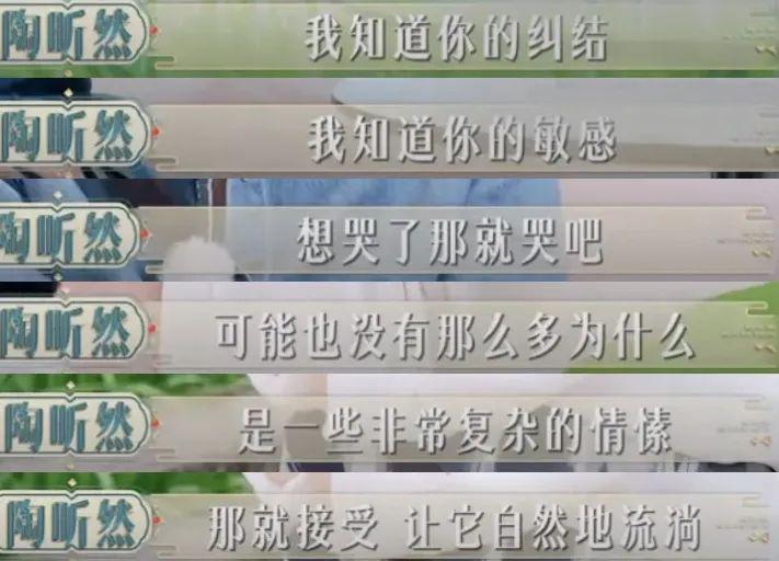 事后,陶昕然给足了双方体面,说的话也很有哲理," 我知道你的纠结,我知道你的敏感,想哭那就哭吧,可能也没有那么多为什么,是一些非常复杂的情愫。"