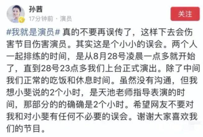 奈何下了节目就不是她了,孙茜发文声称排练时间足足有一天,并非张小斐说的两个小时。