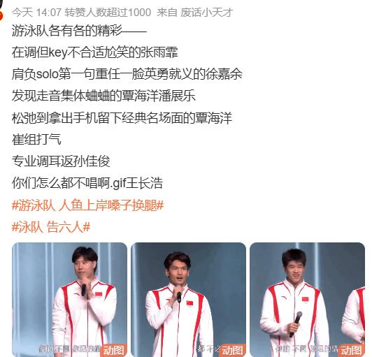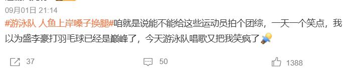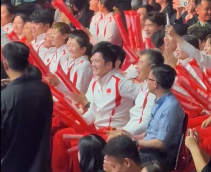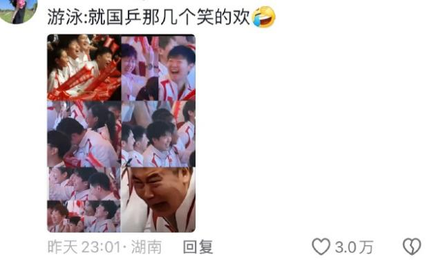 更好笑的是国乒队的朋友们,不管是盛李豪打球还是游泳队唱歌,他们都在台下全程呲着大牙在那嘎嘎乐。