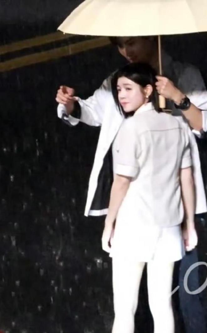 只见,身穿一身白色套装的她,手里撑着伞跌跌撞撞闯入男主周柯宇的怀抱中,好一出浪漫的偶像剧桥段。