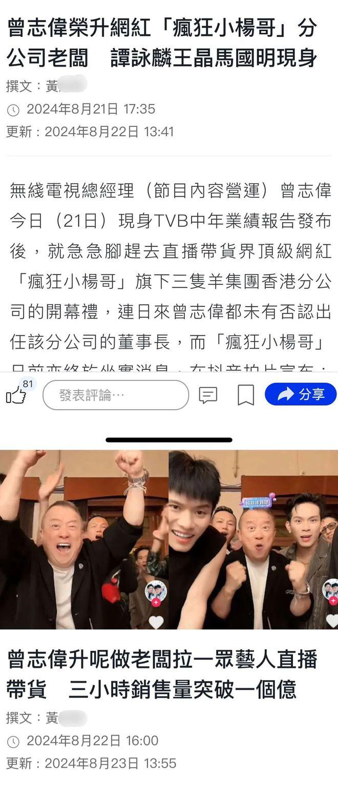 事情是这样的,8 月底三只羊不是在香港开分公司嘛,曾志伟还带着一众 TVB 演员捧场,连他的儿媳妇也到场支持,就连那些天王级别的艺人都为此站台