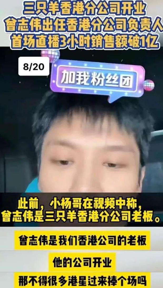 三只羊到香港开分公司时,小杨哥本人亲自在直播中承认曾志伟是三只羊香港分公司的老板,所以才会有这么多港星来捧场。