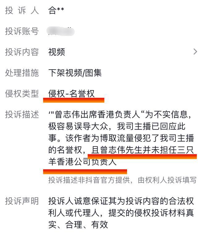 其次,投诉描述中直指 " 曾志伟出席三只羊香港分公司负责人是不实信息 ",并明确表示 " 曾志伟先生并未担任三只羊香港公司负责人 "。