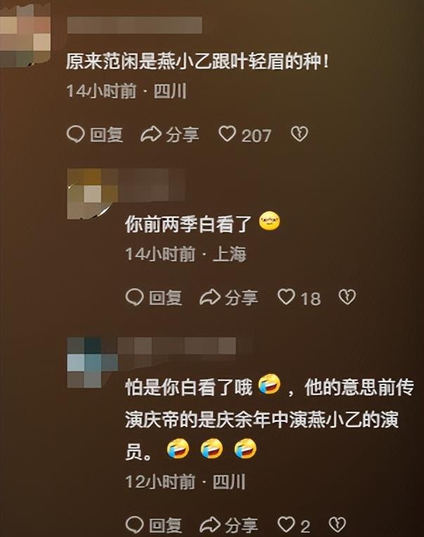 而下面这位网友的评论更癫!他说:原来范闲是燕小乙和叶轻眉的种!