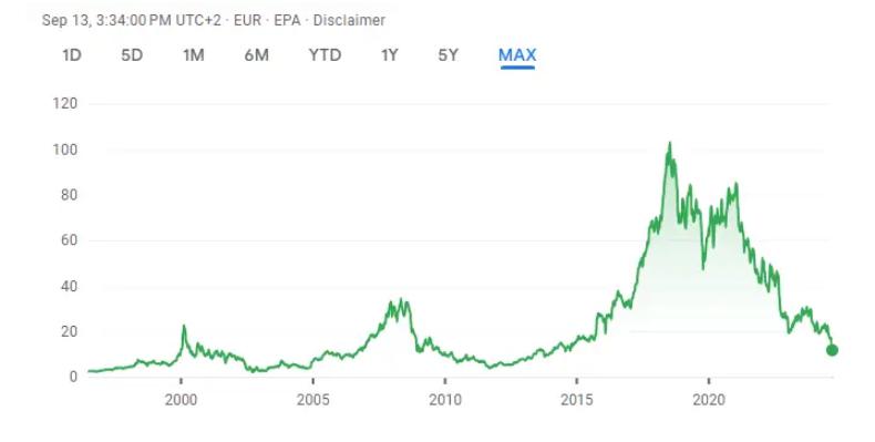 不过有趣的是,如果将时间线拉长,你会发现育碧的股价曾长期虚高。