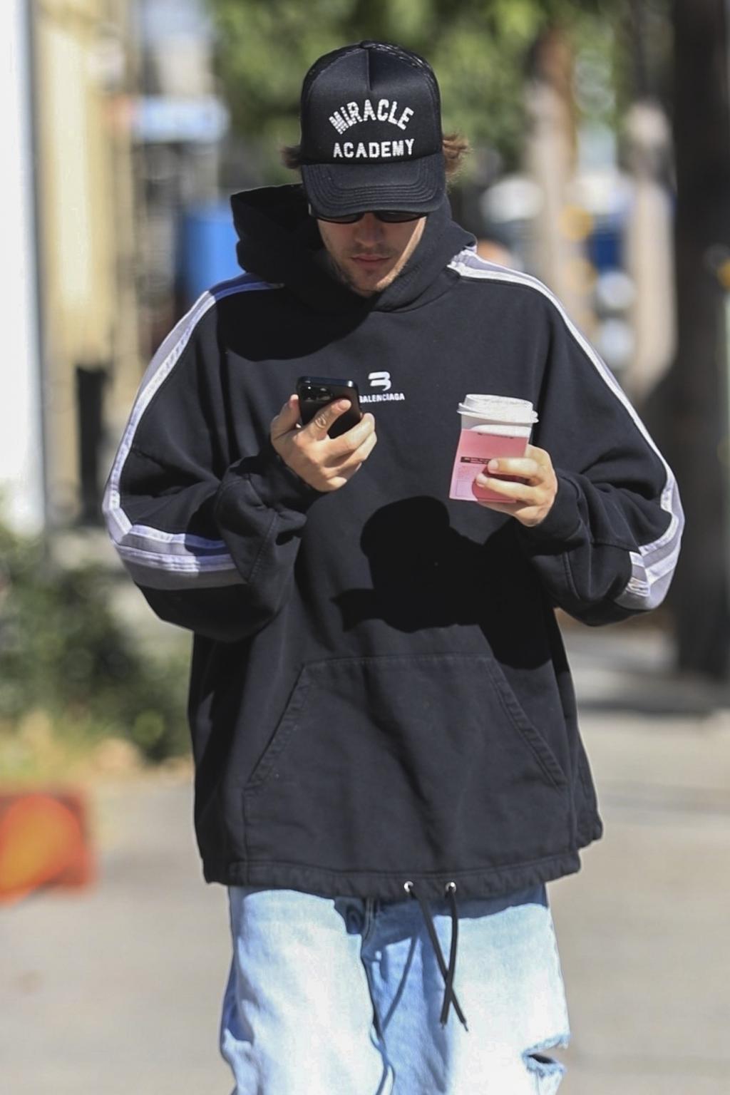 当地时间 2023 年 11 月 11 日,美国洛杉矶,贾斯汀 - 比伯(Justin Bieber)街头喝咖啡。