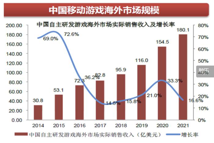 这种情况有明确的先例可参考。由于 2018 年的 " 版号寒冬 ",以及后续面向国内游戏行业的政策透露出不确定性,大批厂商把目光转向出海。于是,2020 年前后国内迎来一波出海潮。根据伽马数据,2021 年国内手游收入达 2255.38 亿元,同比增长 7.6%。相比之下,2021 年中国自研手游海外市场销售收入达 160.9 亿美元,同比增长 21.8%。出海手游整体收入体量在 2021 年已经突破千亿人民币规模,收入增速也高于手游大盘增速。