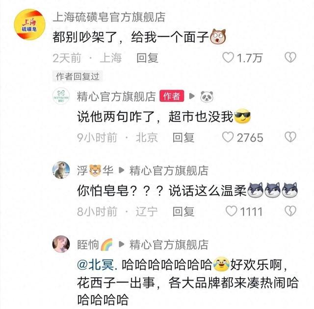 当有网友说精心是卖味精的时候,精心也不甘示弱:“你们知道我是谁吗?我是协和!”精心还与邮政、运康食品、美妆等品牌展开了激烈的对话,引发了网友的笑声。