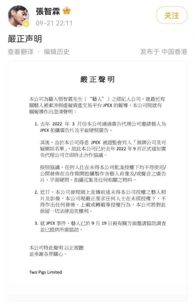 张智霖21日晚在微博发表所属经纪公司声明,回应被牵涉香港“币圈”骗局。
