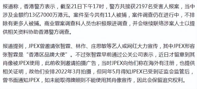 据悉,张智霖曾为JPEX拍摄过广告,并担任其品牌大使。此前张智霖的经纪人对此进行了回应,称张智霖并无参与任何投资,也没有金钱的损失,并且张智霖在去年为其拍摄完广告后,他们就曾书面通知JPEX,如果该公司未能取得执照,就不能使用其肖像宣传,并会保留追究权利。