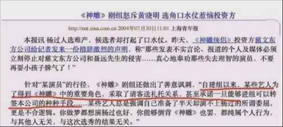 因口无遮拦,爆出黄晓明为抢杨过一角到处送礼的内幕,直接打脸张纪中,从而被一票否决,彻底与 " 杨过 " 无缘。