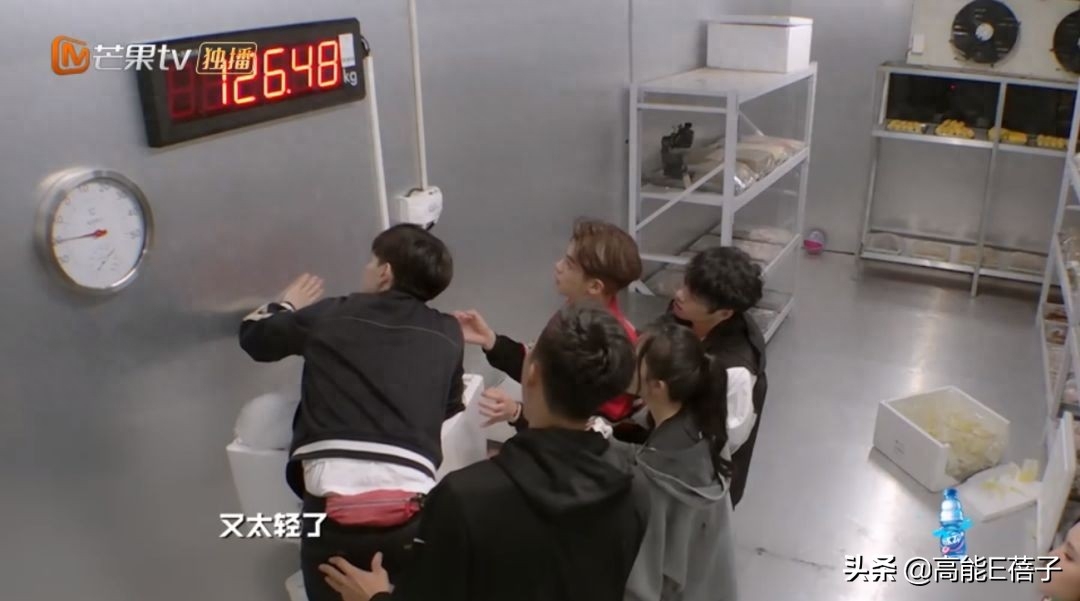 又让魏大勋和张国伟抱在一起站在秤上强行发糖。抱到地老天荒、用冷库里的食材增增减减了好久,才凑齐175kg……