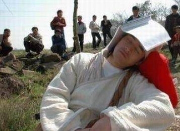 胡歌在片场累到睡着了,睡前还不忘拿剧本遮阳。