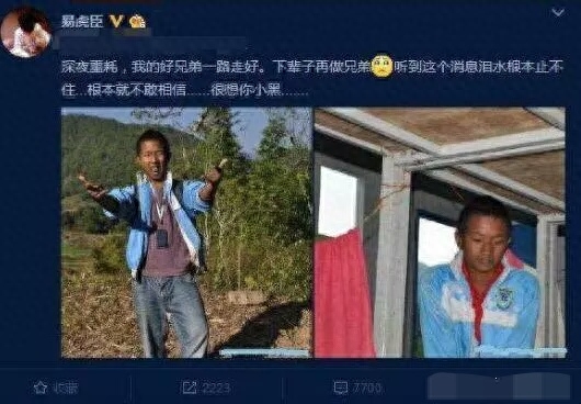 不过更让人心疼的是,当年易虎臣的农村好友,小黑。小黑在之前,就有着先天疾病,在节目结束后时,节目组还带他去治疗。据节目组的工作人员说,本以为小黑会越来越好,可是没想到在节目播出后不久,小黑就离开了....愿天堂没有疾病。
