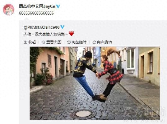 2月14日,周杰伦中文网官方微博转发某微博,晒出周杰伦与爱妻昆凌的创意合影。照片中,二人手牵手在街道上跳起,刚好摆出一个心形,画面温馨甜蜜。