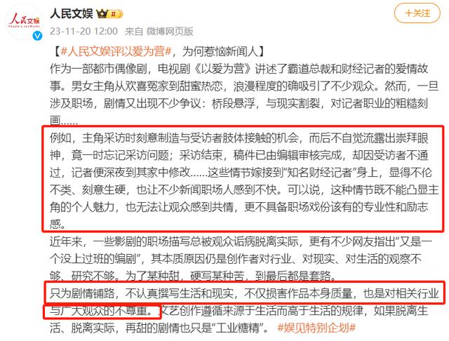 人民文娱直接发文批评《以爱为营》,直言剧中情节既不能凸显主角的个人魅力,也无法让观众感到共情,更不具备职场戏份该有的专业性和励志感——根本就是对相关行业和广大观众的不尊重!
