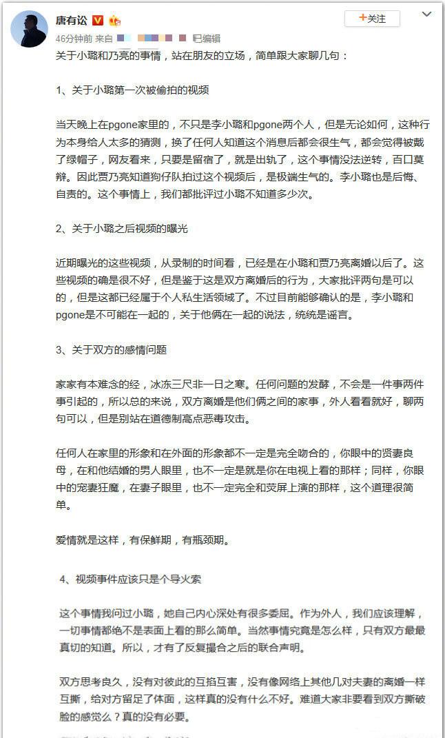 11月15日,李小璐好友发文谈及李小璐和贾乃亮离婚之事,他表示近期曝光的视频是在离婚后拍的,属个人私生活,而且可以确认李小璐和PGone不可能在一起。同时还表示:“任何人在家里的形象和在外面的形象都不一定是完全吻合的。”最后,他认为两人离婚没有互掐互撕已经很是体面,事情究竟是怎么样,只有双方最最真切的知道,外人不应该站在道德制高点攻击。