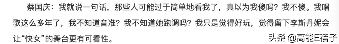 他后来回应,那只是觉得好玩,留下李斯丹妮会让“快女”舞台更有可看性。